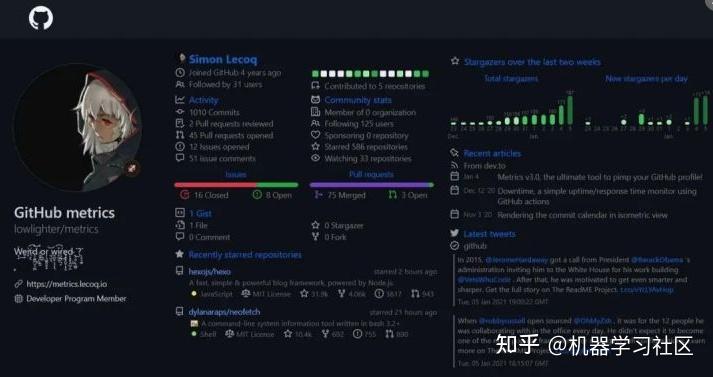 Metrics 可用于生成关于你的信息图表,因此你可以将它们嵌入到 GitHub 个人资料中,让其他用户更多地了解。显示你的 git 统计数据以及日历、收藏的音乐、网站、最后的推文、项目、语言等。这可能看起来有点花里胡哨,但如果使用得当,它确实可以帮助你的个人资料脱颖而出。