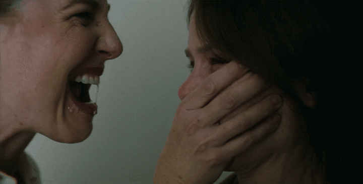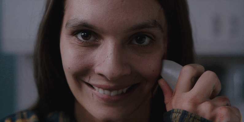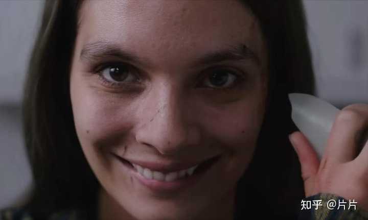 紧接着,劳拉用花瓶碎片,一点一点切割着自己的脸皮。
