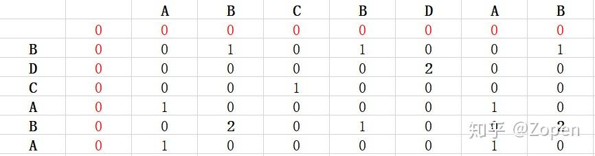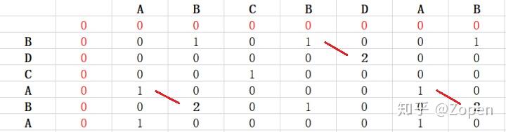 从上图的红色路径显示,X 和 Y 的最长公共子串有 3 个,分别为 “BD”、“AB”、“AB”。