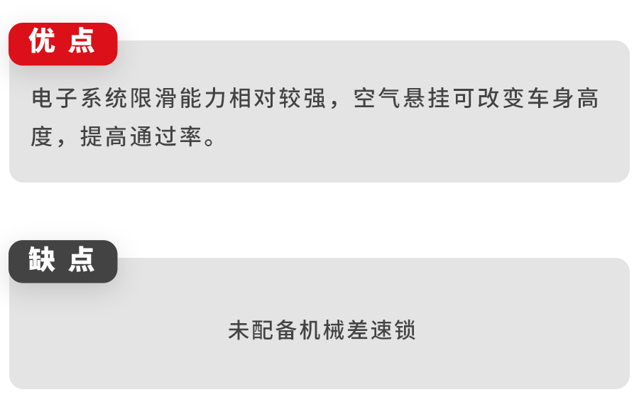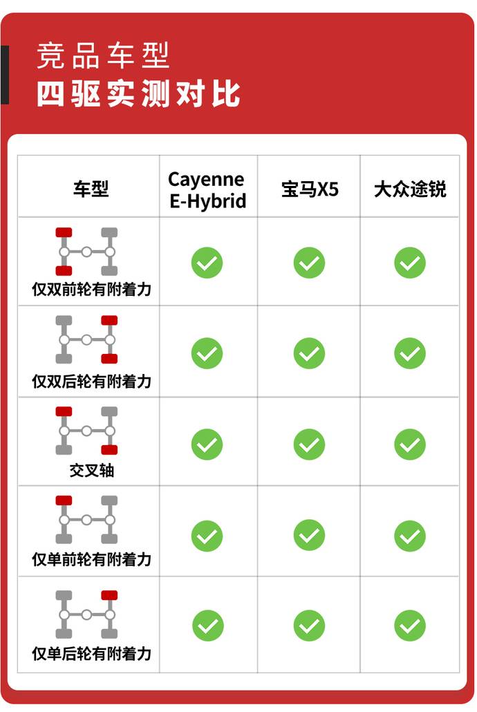 在单后轮有附着力脱困测试中,动力分配更加偏向后轮的Cayenne E-Hybrid,反而较为轻松的通过了测试。虽然这套四驱系统并未配备机械差速锁,但是Cayenne E-Hybrid却成功通过了四驱测试,所以保时捷这套电子系统的限滑能力还是值得肯定的。