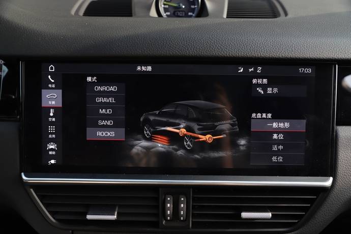 在四驱实测过程中,我们将底盘高度调至一般地形,此时底盘高度已经足够高,并不会托底。驾驶模式调至越野能力最强的ROCKS攀岩模式,虽然攀岩模式下的中控屏显示有两把锁,但是Cayenne E-Hybrid并未配备后桥差速锁。
