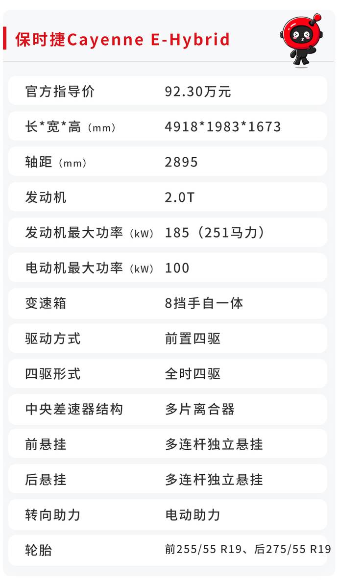 保时捷Cayenne E-Hybrid采用的是全时四驱系统,前后轴均为开放式差速器,中央差速器结构为多片离合器,依靠电子系统进行限滑。此外,该车标配空气悬挂和主动式后扰流板,并提供五种驾驶模式,分别为公路、碎石、泥地、沙地、攀岩模式。