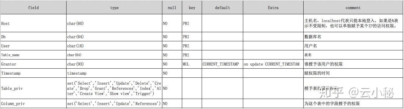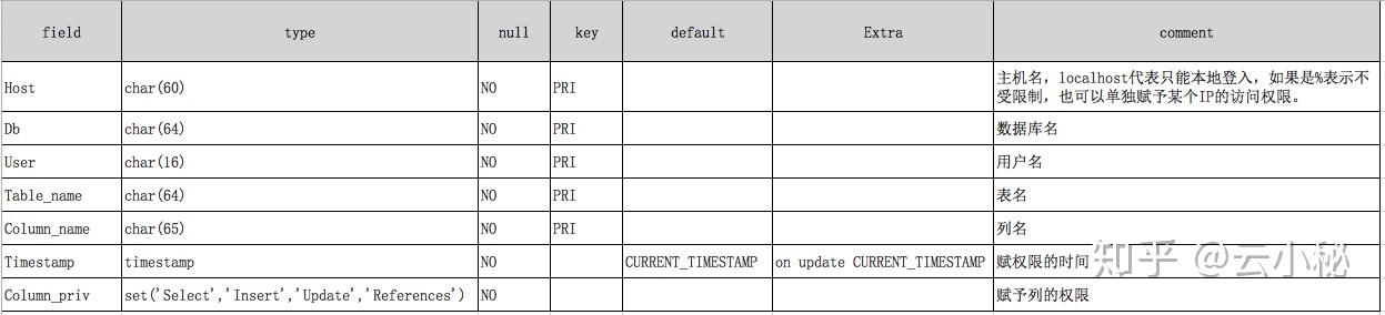 上面的Column_priv比较奇怪,因为照理说tables_priv只显示表级别的权限,列级别的权限应该在columns_priv里显示才对。后来查了资料才知道,原来这是为了提高权限检查时的性能,试想一下,权限检查时,如果发现tables_priv.Column_priv为空,就不需要再检查columns_priv表了,这种情况在现实中往往占大多数。