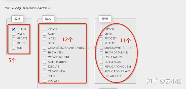 - 管理权限 主要是管理员要使用到的权限,包括:数据库创建,临时表创建、主从部署、进程管理等