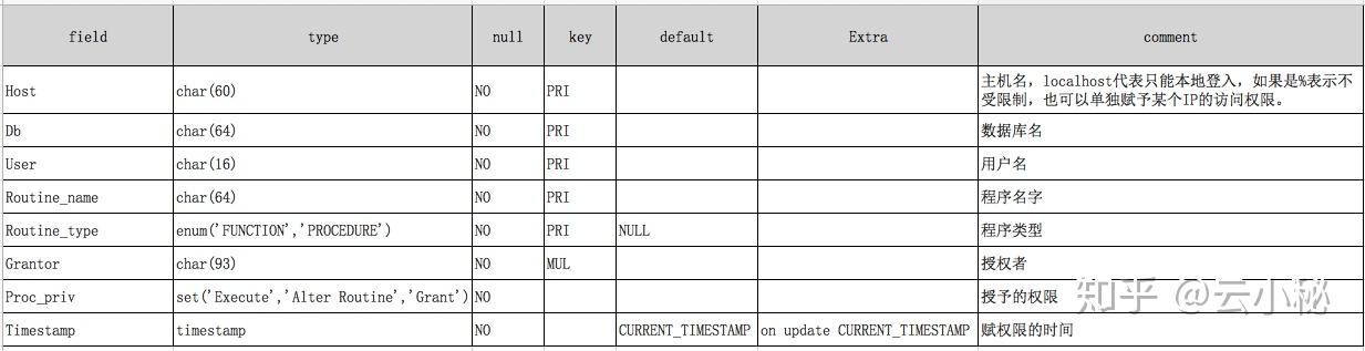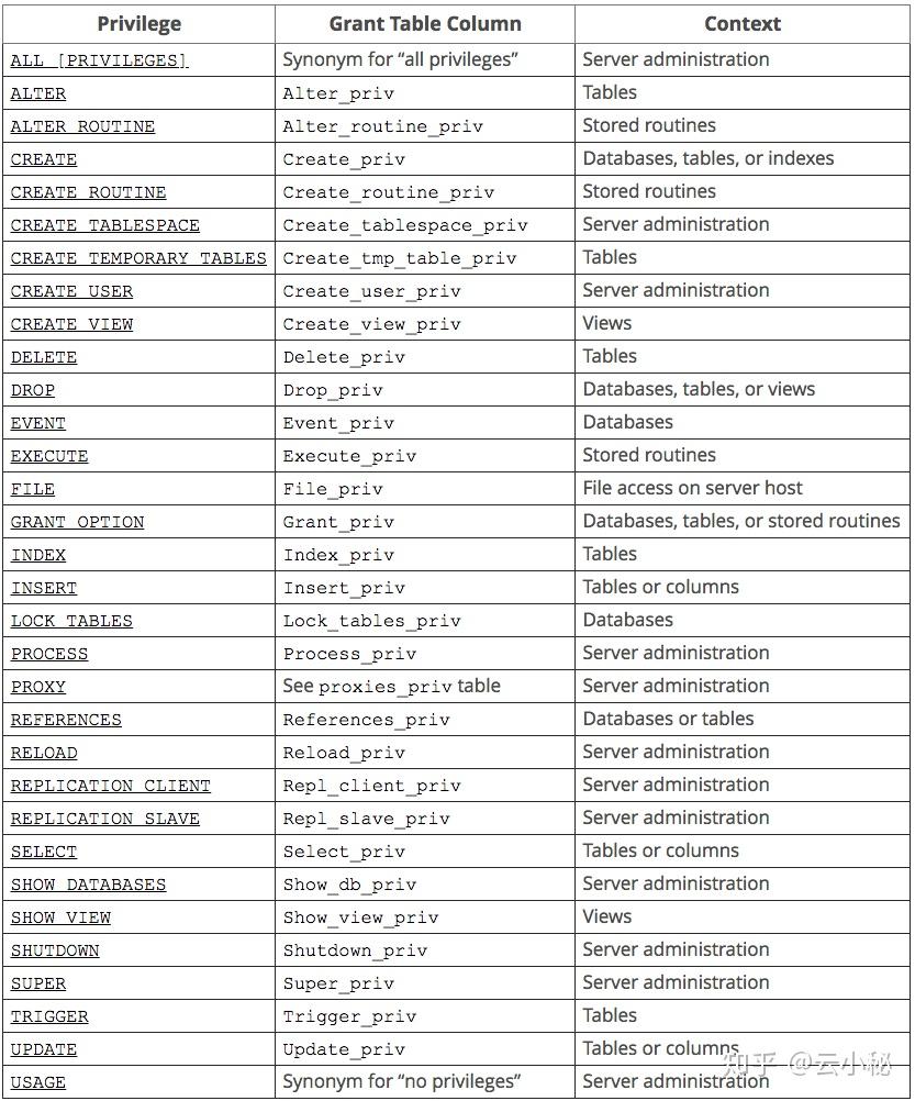 第一列表示可以在grant命令中制定的权限第二列对应着几张权限表(user,db,tables_priv, columns_priv, procs_priv)中的列第三列表示权限的作用范围,其中Global(Server administration)对应 mysql.user 表,Database 对应 mysql.db 表,Tables 对应 mysql.tables_priv 表,Columns 对应 mysql.columns_priv 表,Stored routines 对应 mysql.procs_priv 表。