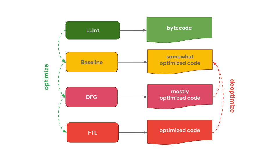 JavaScriptCore(缩写为JSC),Apple 的 JavaScript 引擎,被用于 Safari 和 React Native 两个项目中,它通过三种不同的优化编译器使效果达到极致。低级解释器 LLInt将代码解释后传递给 Baseline 编译器,而(经过 Baseline 编译器)优化后的代码便传给了 DFG 编译器,(在 DFG 编译器处理后)结果最终传给了 FTL 编译器进行处理。