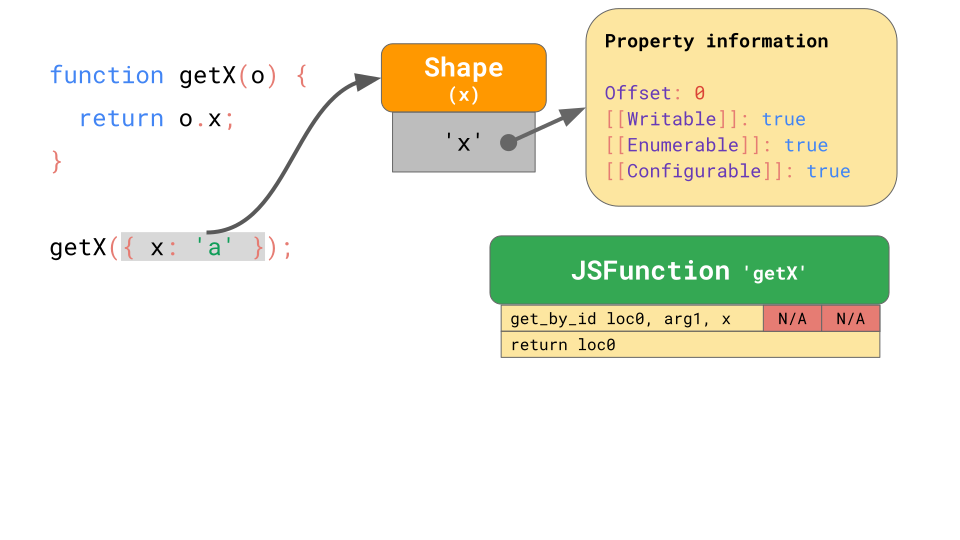 对于后续运行,IC 只需要对比 shape,如果它与以前相同,只需从记忆的偏移量处加载该属性值。具体来说,如果 JavaScript 引擎看到一个对象的 shape 之前被 IC 记录过,它则不再需要接触属性信息——而是完全可以跳过昂贵的属性信息查找(过程)。这比每次查找属性要快得多。