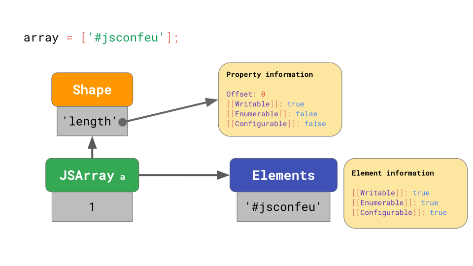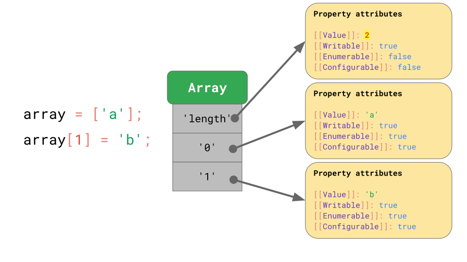 每个数组都有一个单独的 elements backing store ,其中包含所有数组索引的属性值。JavaScript 引擎不必为数组元素存储任何属性特性,因为它们通常都是可写的,可枚举的以及可配置的。