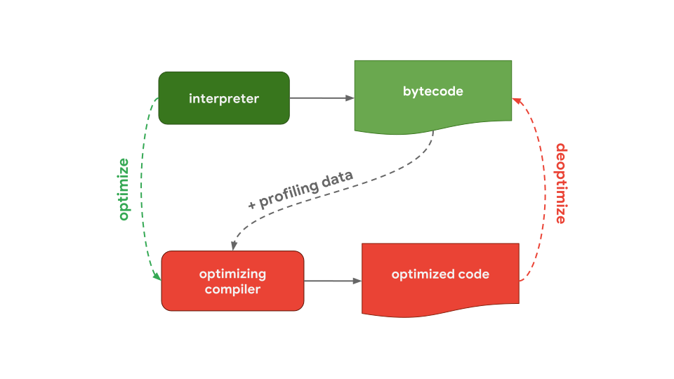 一般来说,(所有 JavaSciript 引擎)都有一个包含解释器和优化编译器的处理流程。其中,解释器可以快速生成未优化的字节码,而优化编译器会需要更长的时间,以便最终生成高度优化的机器码。