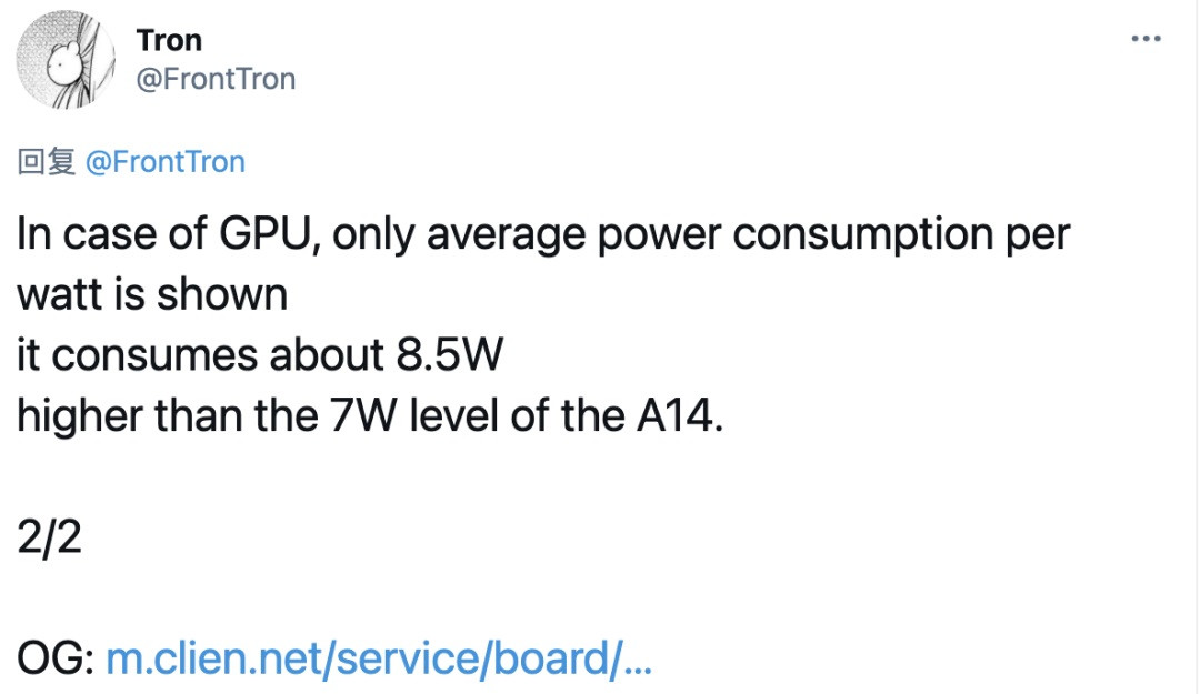 除 CPU 跑分外,A15 仿生的 GPU 表现也被曝光了出来。@FrontTron 表示,A15 仿生芯片的功耗为 8.5W,要知道 A14 仿生也才 7W。所以,A15 仿生还需要进一步优化。