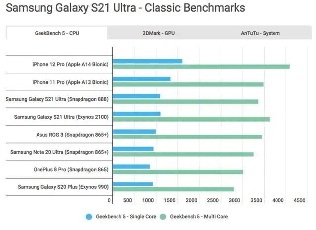 虽然三星 Exynos 2100 性能可以比肩骁龙 888,但是依旧不如 A14 仿生。外媒 Android Authority 测试的 GeekBench 5 跑分数据显示,Exynos 2100 的 CPU 单核成绩 1109 分,多核 3620 分;骁龙 888 的 CPU 单核成绩为 1098 分,多核 3363 分。
