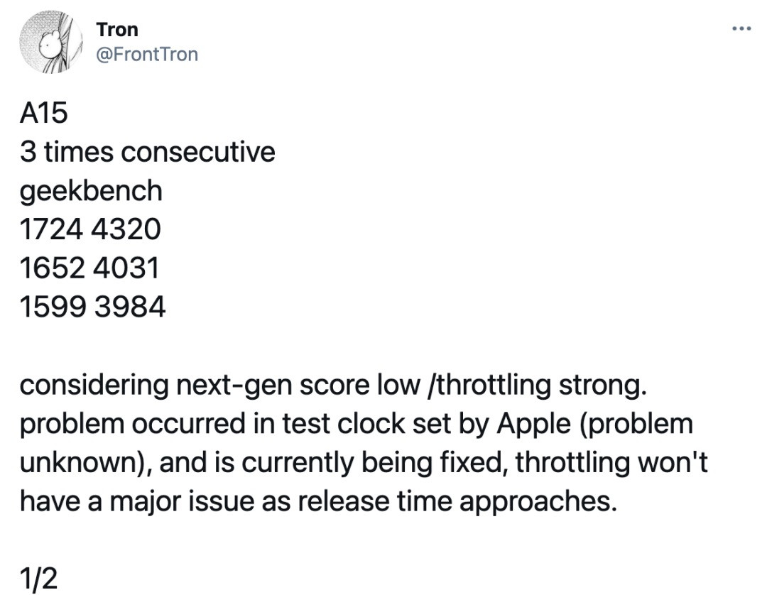 推特用户 @FrontTron 放出了 A15 仿生的三组 GeekBench 跑分数据 ,其中 CPU 单核最高 1724 分,最低 1599 分,多核最高 4320 分,最低 3984 分。