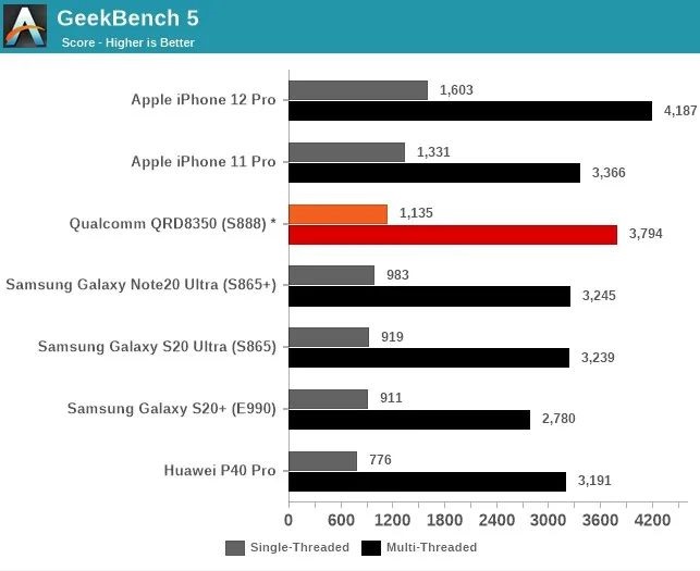 此前外媒 Anandtech 将 A14 仿生与骁龙 888 的跑分进行了对比。在 GeekBench 5 测试中,A14 仿生 CPU 单核成绩为 1603 分,多核 4187 分;骁龙 888 单核则是 1135 分,多核 3794 分。