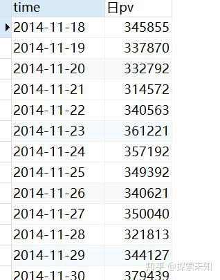 select time,count(*)as'日pv' from taobao_app where behavior_type=1 group by time