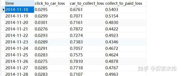 -- 'click_to_car_loss'为点击到加入购物车流失率,'car_to_collect_loss'为加入购物车到收藏商品流失率,'collect_to_paid_loss'为收藏商品到购买流失率