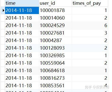 select time,user_id,count(*) as times_of_pay from taobao_app