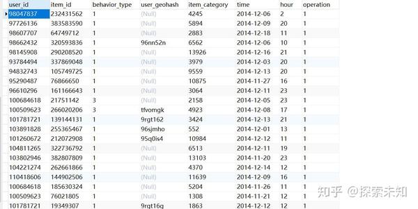 本文数据清洗过程用python相关库进行处理,主要是对时间列进行处理,相关内容可参考 : 探索未知:淘宝app用户行为分析 。最终处理结果如下: