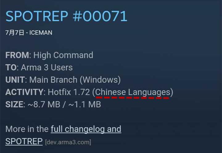 《武装突袭3 Arma3》 在今天SPOTREP #00071更新中增加了 简繁中语言 ,并且国区价格¥249永降至¥149,包含本体+4个DLC的顶尖版价格从¥449降至¥300。等下次打折新史低不是不可以入一波。
