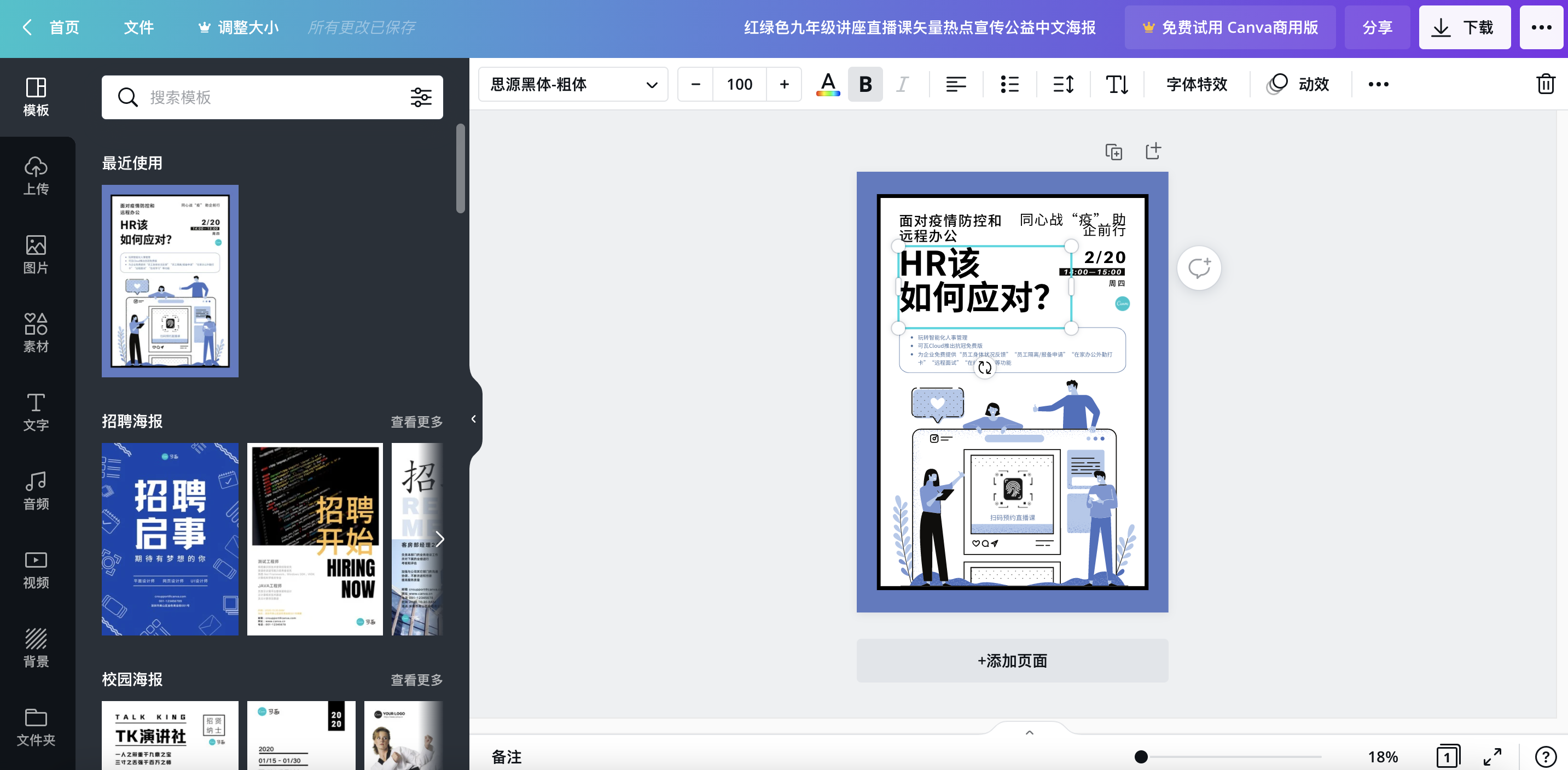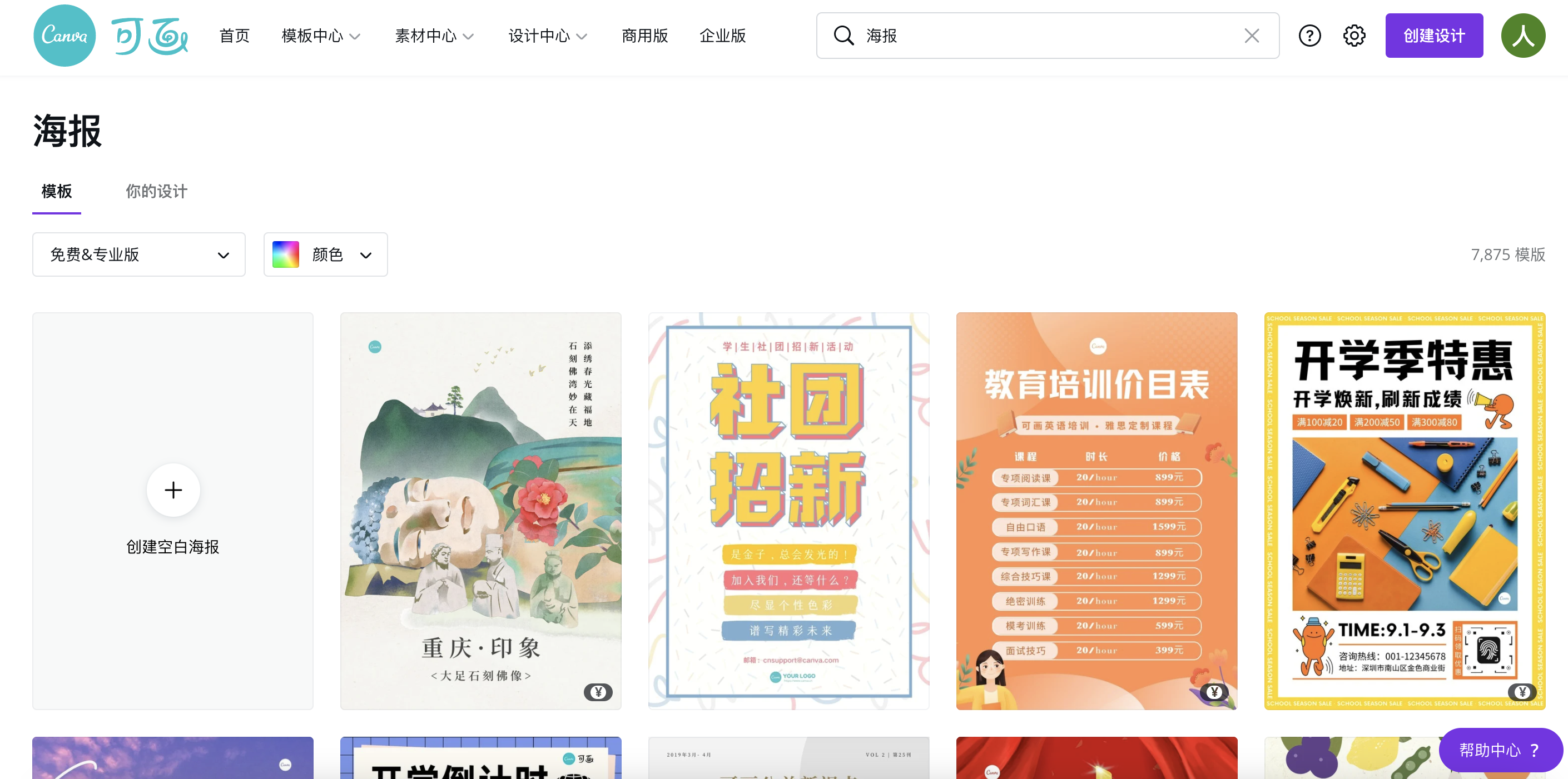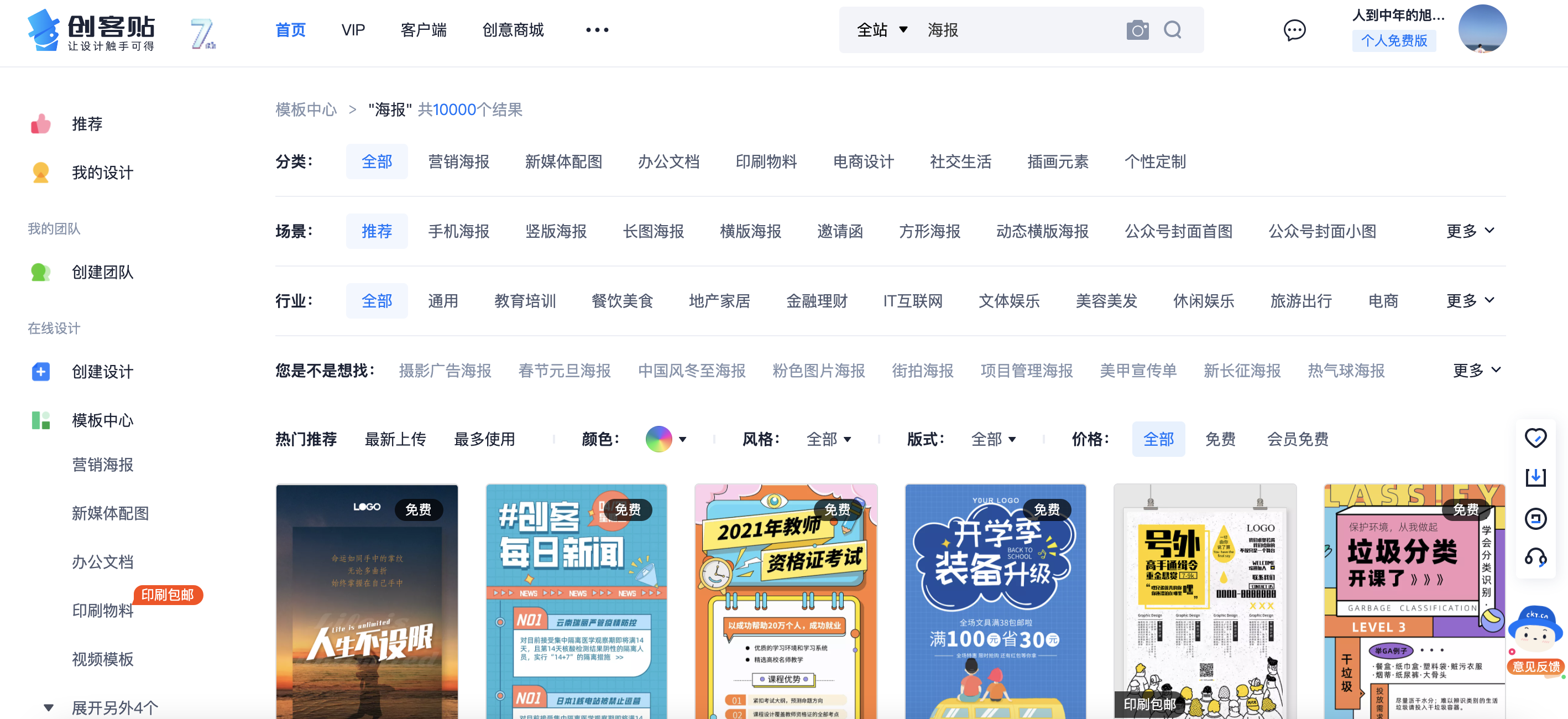 可画的搜索结果可以算得上是“极简“,只有【免费】和【专业版】的区分,就是要钱的模板和不要钱的模板它做了个分类,可能也有一定道理,特别方便我这种白嫖党。