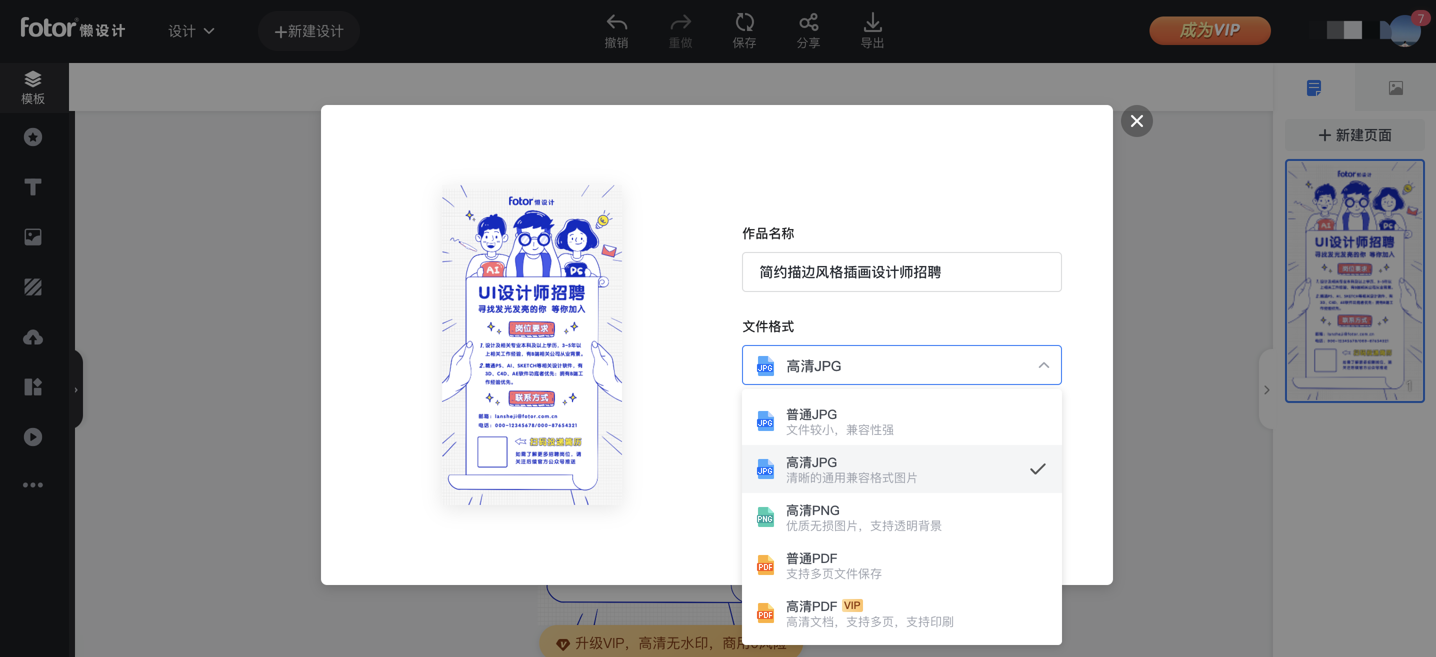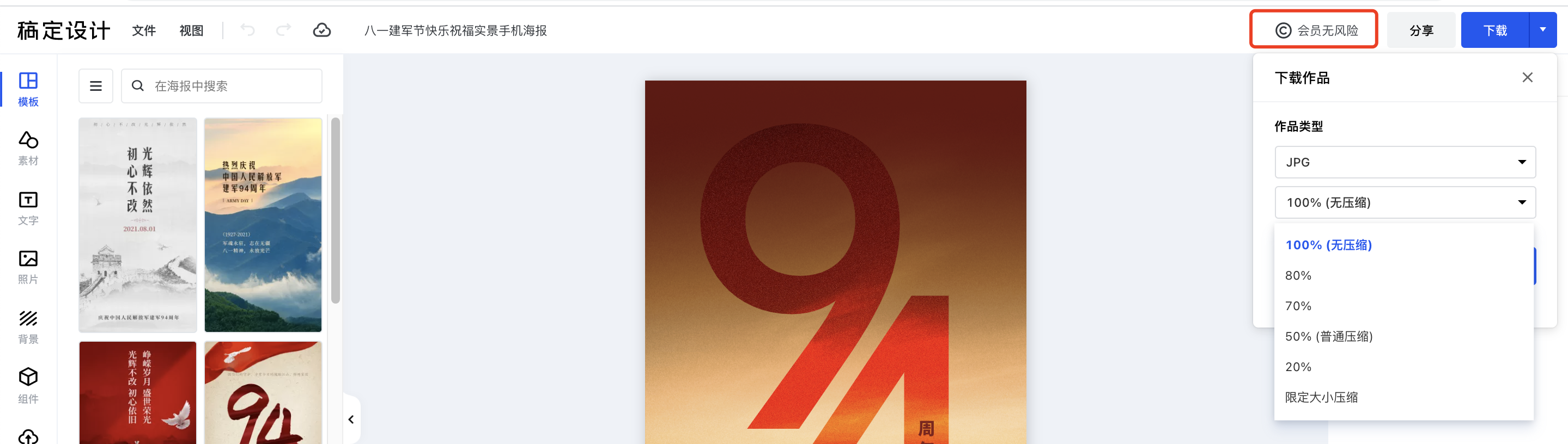 如果没有会员,单个购买模板非常贵。在下载的选项里可以选择图片尺寸,跟上面两个网站不一样的是,它是放到下载这一步来调整,而前面两个网站是在制作过程中就让你确认图片的尺寸大小,这一点有利有弊吧。