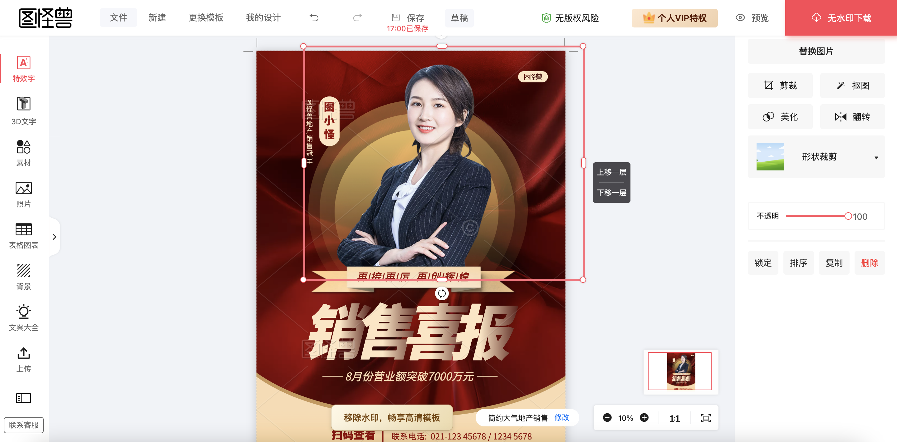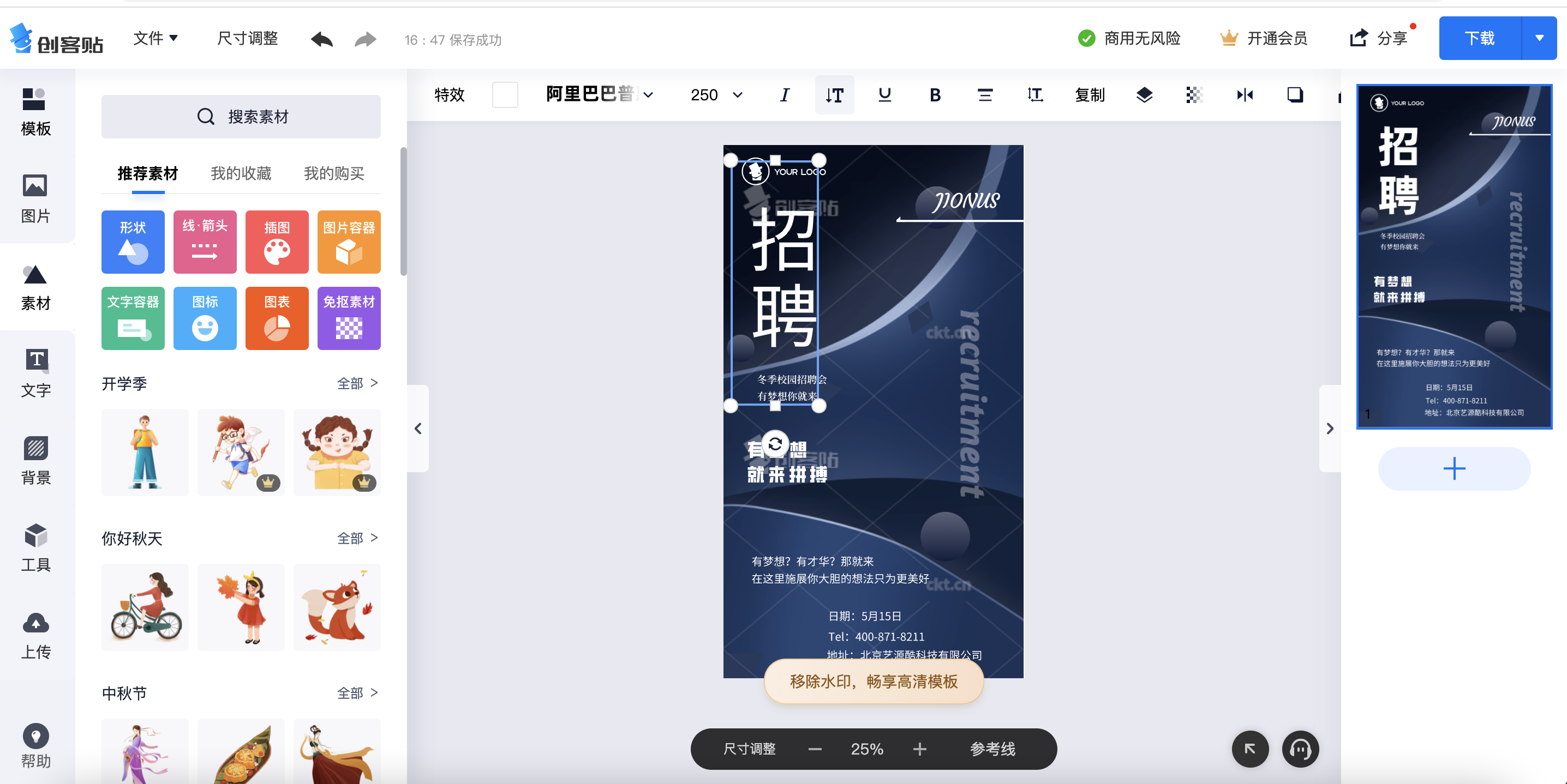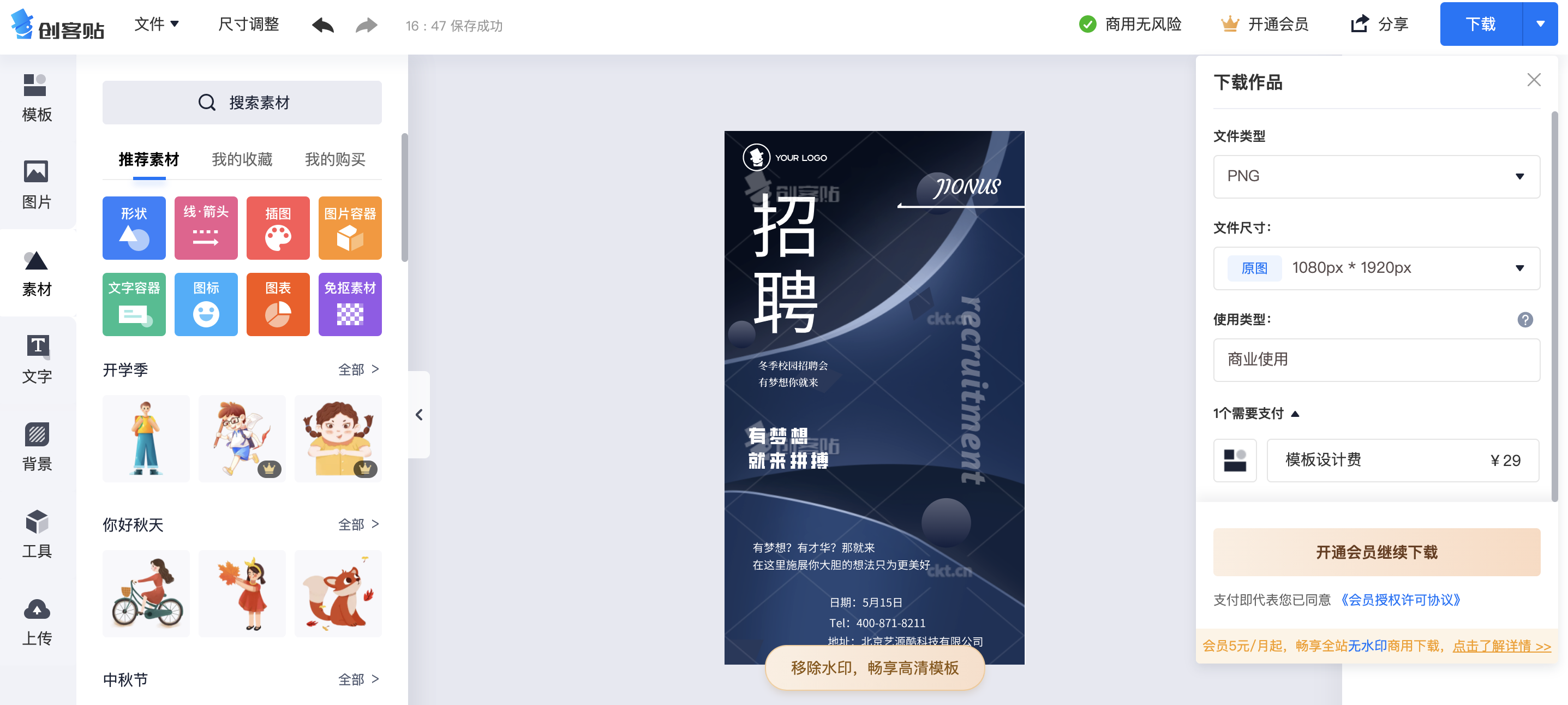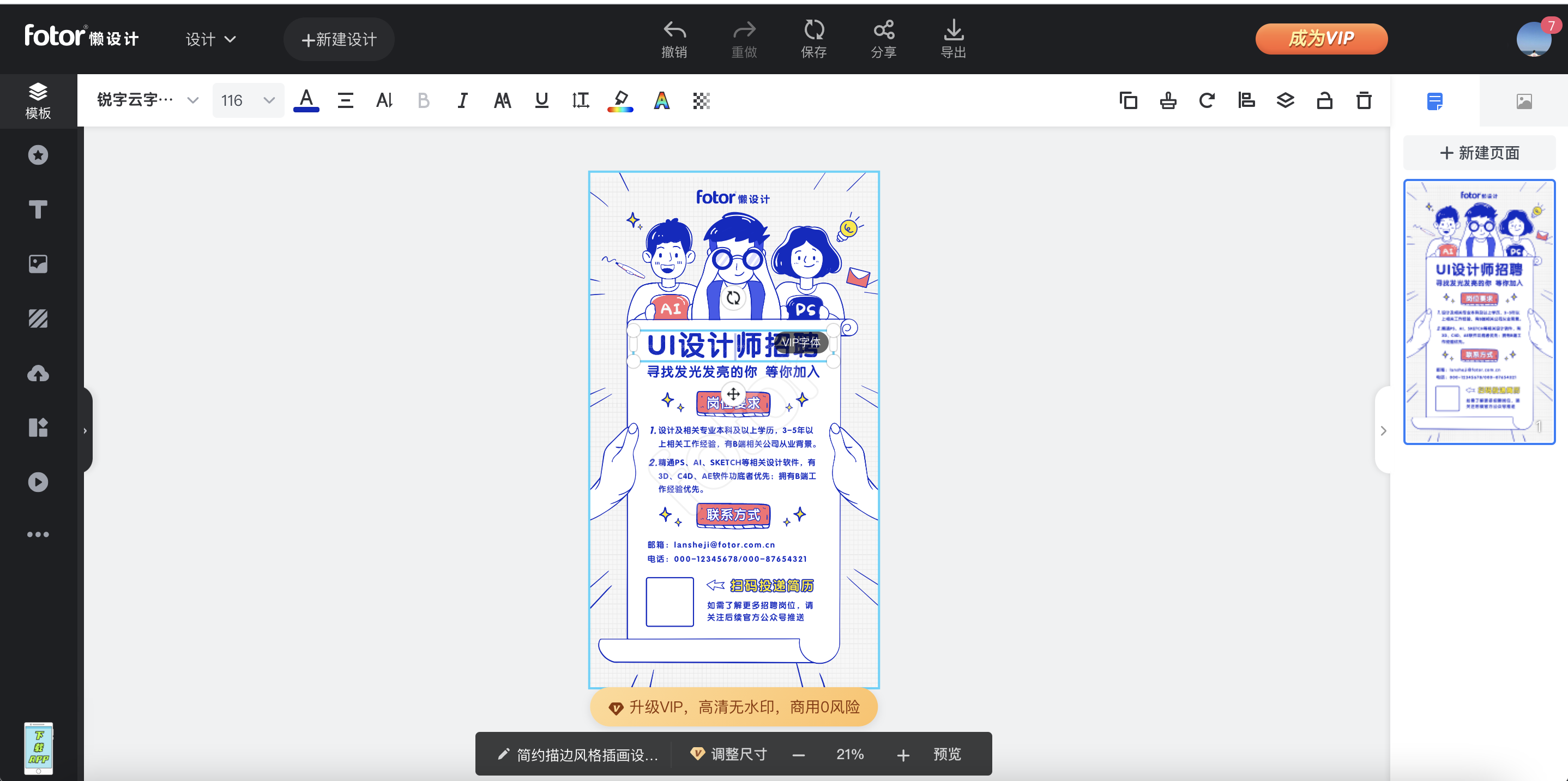 没有会员的话有水印限制,挺影响操作和最终的呈现效果,编辑器的排列跟canva一致,基本功能也都齐全。
