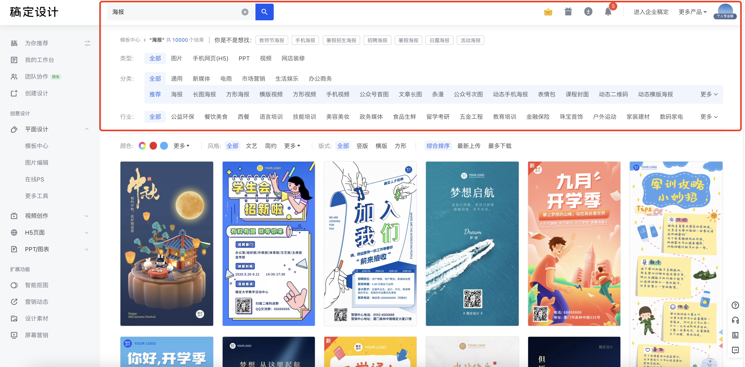 稿定设计的搜索结果和搜索栏相较于其他几个网站(后面会说到)来得清晰, 有条理性、分类精准、种类多 ,能够让我通过简单几次的选择,快速找到自己想要的模板。