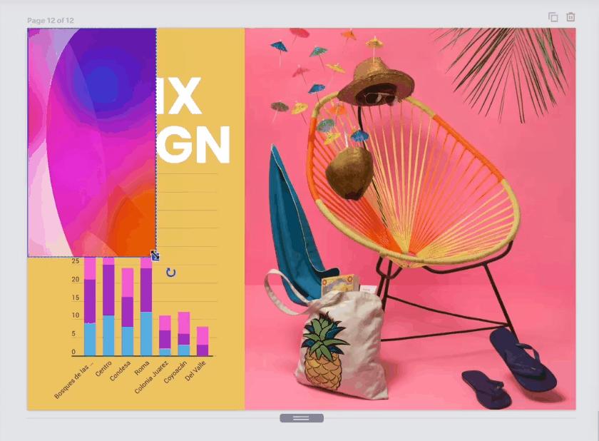 支持插入图片、动图、视频等类型的文件,还可以直接搜索来自Unsplash,Giphy等网站的高质量图像。除演示文稿设计外,还可设计各类图稿、海报。