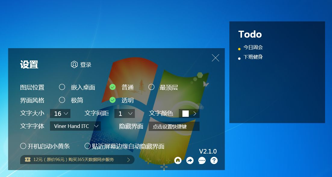 上面就是小黄条放置在桌面的效果,足够简洁,默认透明的界面与任何颜色风格的壁纸搭配都不会显得突兀。