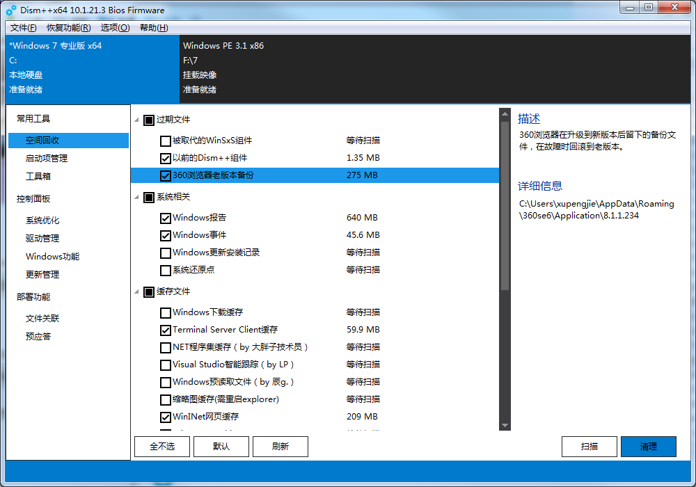 启动程序,点击空间回收,选择你要清理的项目即可进行空间清理。 还支持系统备份,系统出问题后,可以启动Dism++还原系统。