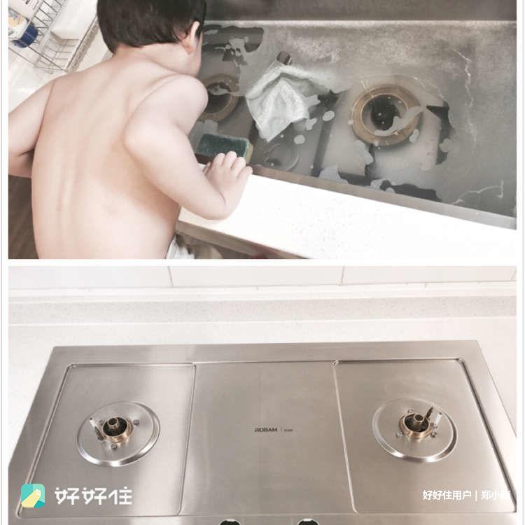 每天洗灶眼其实比擦灶台更省事,洗碗之后,水槽里放氧净,再加一点洗洁精,加水。30分钟之后用百洁布轻轻擦洗冲水就好了,而没有灶眼的台面简直不能更好擦……ps:泡水的同时,抹布,洗碗布和水槽同时也被清洗了~有个小孩乱入,跑来吹泡泡?