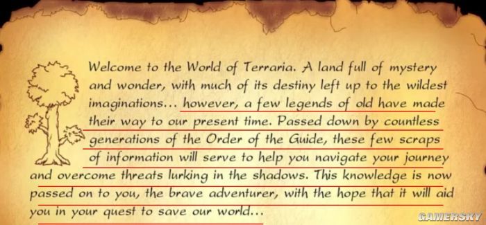 同整篇流程没几句明白话的知名受苦游戏《黑暗之魂》一样,《泰拉瑞亚》也通篇采用碎片化叙事来讲述自己的剧情,将故事的发展埋藏进NPC惜字如金的只言片语和地形环境的悄然变动中。而游戏最大的谜团和贯穿全局的线索,则被隐藏到了开场就成为玩家好伙伴的NPC向导身上。
