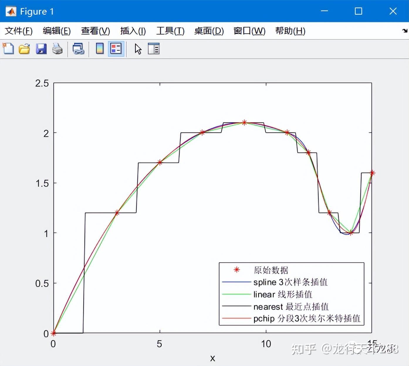 (3) pchip: 分段3次埃尔米特插值。采用分段三次多项式,除满足插值条件,还需满足在若干