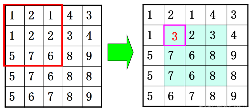 均值滤波:有效的消除一些高斯噪声,但是很容易导致图像边的模糊。如果是需要做图像分割,使用该滤波方法会导致分割失败。不易选择均值滤波;均值滤波法的原理如下图,取1个像素点周围了8个像素点的均值,然后让这个像素点的值等于其余8个像素点的平均值。