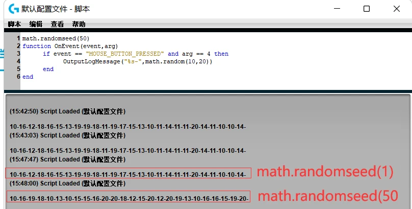 可以看到,随机数种子math.randomseed(1) 与 math.randomseed(50),种子不同,得到的随机数也不同,