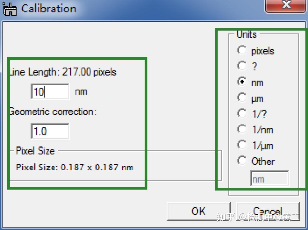 在Microscope下有三种calibrate模式,分别基于图片实空间长度、傅里叶变换空间晶面间距和图片中的仪器信息。第三种不适用于非Gatan公司图片。选择第一种校正方法,如图3所示,利用左侧工具栏工具拖动识别线段与已知线段重合(可以使用shift保持水平)。完成之后点击ok,出现如图4所示的的calibration对话框中选择合适的单位并输入准确的数值。然后点击Ok即可。