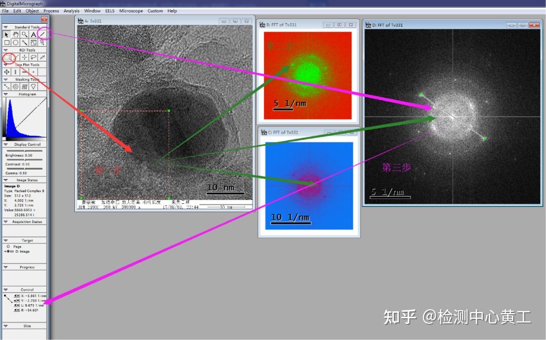 图6中演示的是傅里叶变换测量晶面间距的过程。选区傅里叶变换区域时需要按住Alt,才能选取合法区域。出现的图片中对应的衍射点/环的距离/直径的一半的倒数,为对应的晶面间距。