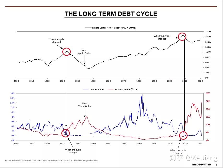 上图是过去美国100多年债务占GDP比例,对应的是财政宽松程度。下图蓝色是利率,红色是央行购入金融资产,对应货币宽松程度。对照历史我们知道,第一个画圈点是1930年代美国历史上著名的大萧条,当时财政货币都宽松以应对大危机。左边低点是一战后美国和西欧持续繁荣的 Roaring Twenties,右边低点是二战后美国开始空前强大,两者都是所谓的新秩序建立。此后债务一路扩张,货币有高有低,直到2008年又一次大危机。