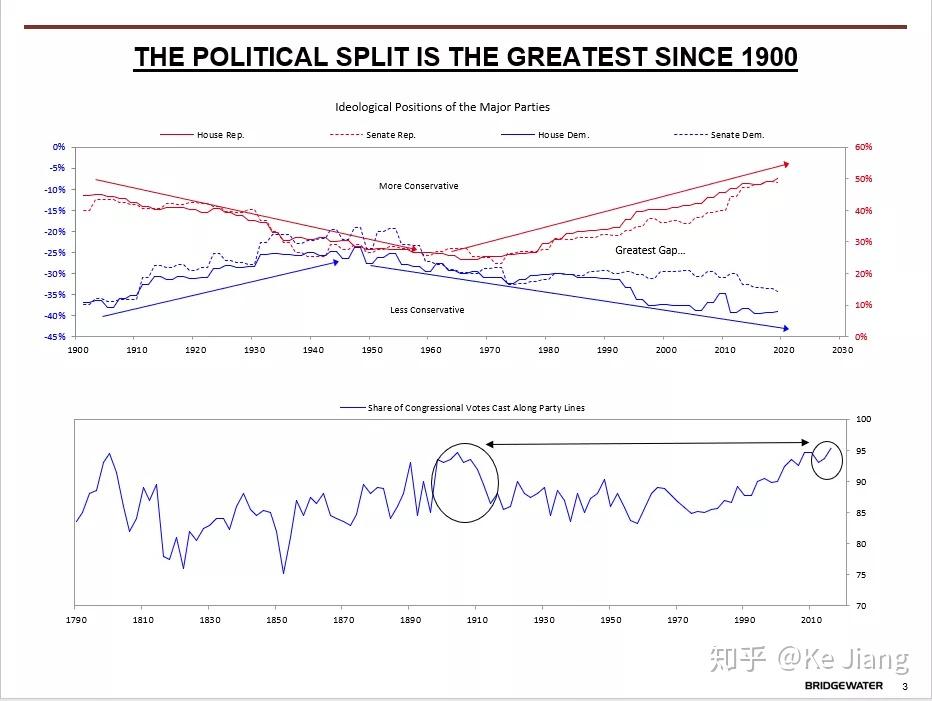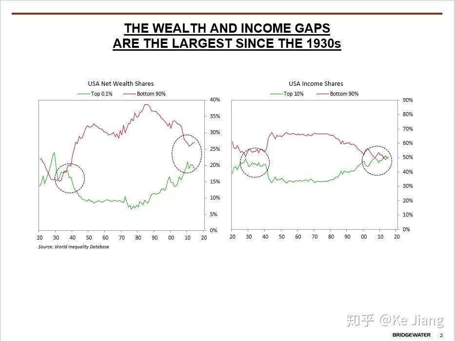 贫富差距严重不仅仅是个经济问题,它还会引发一些政治问题。Dalio 依然以美国为例: