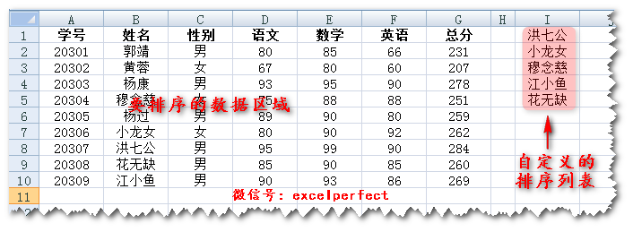 如下图所示,我们想按单元格区域I1:I5中的顺序对单元格区域A1:G10进行排序。也就是说,无论数据如何变化,在单元格区域I1:I5中的5名同学都是按照这样的顺序排列。