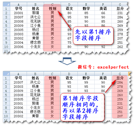 Excel将会以“性别”作为主要关键字升序排列,以“总分”作为次要关键字降序排列,即主关键字排序相同的,再以次关键字排序。结果如下图所示: