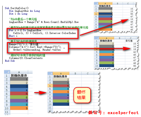 l 代码中,首先使用ColorIndex属性获取列A中单元格颜色索引值,并将这些值存储在列C中的相应行,然后对列C排序,从而达到对列A按颜色排序的效果。