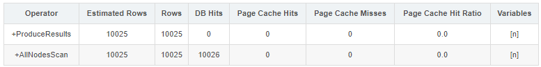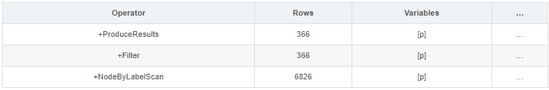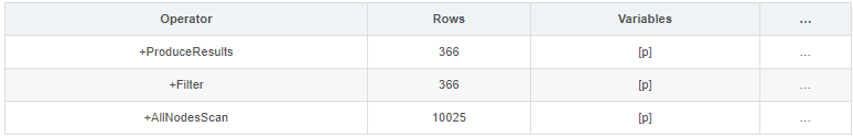 从最后一行开始,我们注意到的第一件事是, “ Rows ” 列中的值似乎很高。 如果查看 “ Operator ” 列,我们将看到已使用 AllNodesScan ,这意味着查询计划程序已扫描数据库中的所有节点。