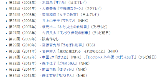 2004年起为第一届,参与对象为NHK电视台及各家民间电视台所制播的连续剧。