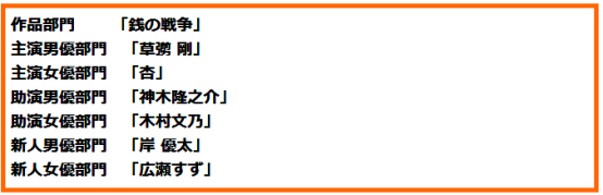 本次冬季档评选结果也出炉了,「A LIFE〜愛しき人〜」夺得四冠,囊括了“最佳作品”、“最佳男主角”、“最佳男配角”和“最佳女配角”。