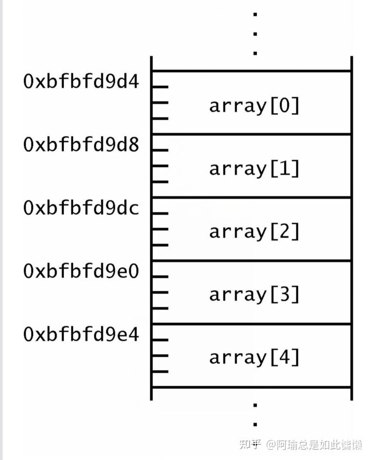 数组是将固定个数且相同类型的变量排列起来的对象。如一个int array[5];在内存空间中排布如下。