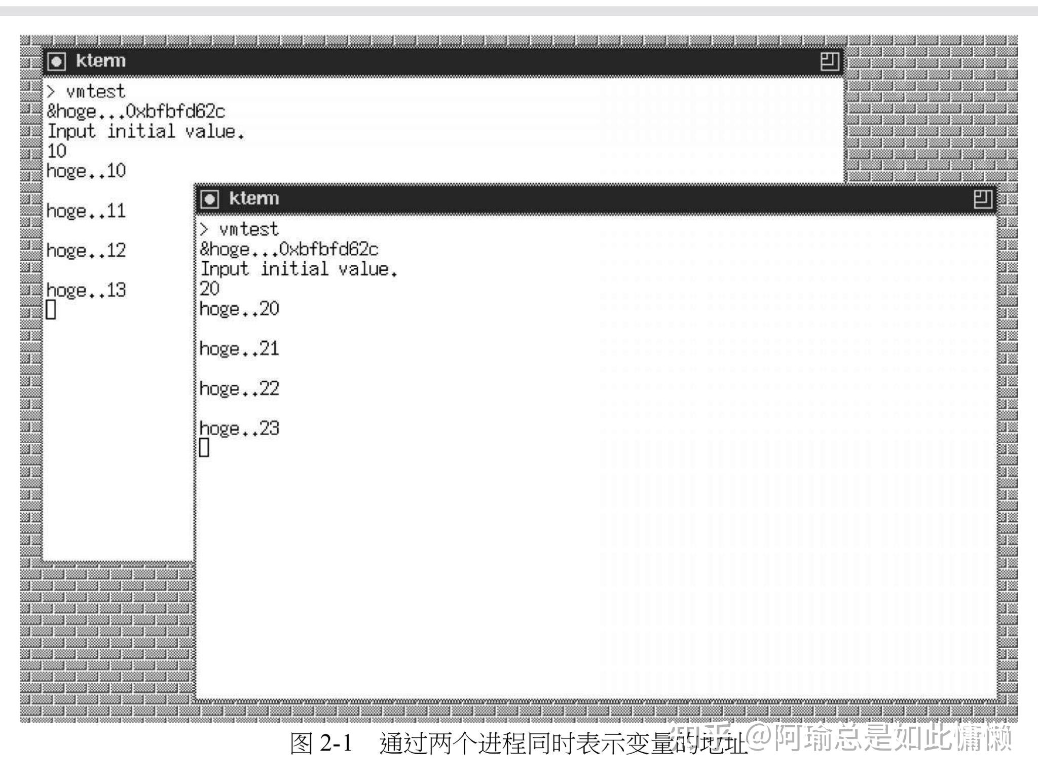 这个图是书中原本的截图,可以看到其中两个进程中变量存储在了同一个内存地址处。而且可以看到两个程序是同时都在运行状态的,但是地址却完全一致。