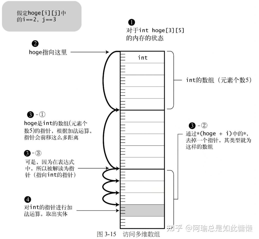 其实可以看出来,对于hoge这样数组的数组,hoge相当于是一个二维指针(指向数组的指针),因此可以首先通过一个指针运算先偏移到高维数组的地方。这也是为什么函数声明时候只可以省略最高维数组的大小的原因,因为其余维度数组大小要用来进行偏移操作。而*(hoge+i)其实是一个一维指针,表示他仍然可以进行指针运算来偏移到对应想要访问的数据上。