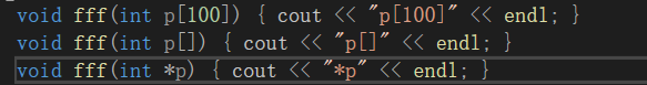 也就是对于这个void fff(int *)这样的一个函数原型已经有了对应的定义主体,然后后边又重复定义导致了错误。说明这三种写法其实对于编译器来说就是一致的。