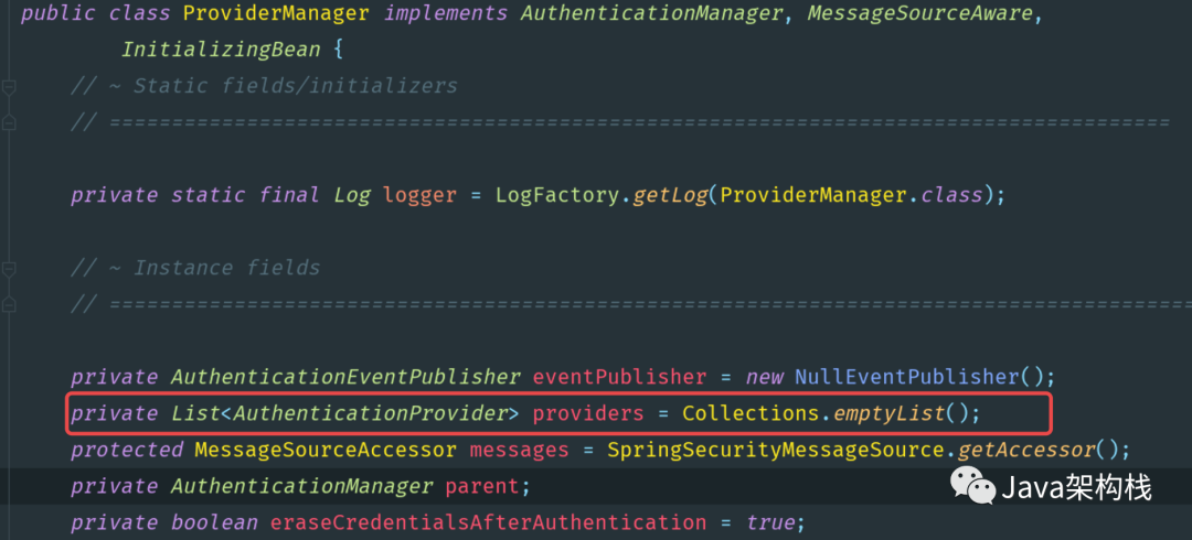 Authentication Manager是负责管理协调认证工作的,但并不负责认证功能的真正实现,认证功能的真正实现是由 Authen tication Manager 中引用的 Authen tication Provider 类来完成的,通过源码我们可以看到Authen tication Manager 中引用了一个providers列表,如下所示: