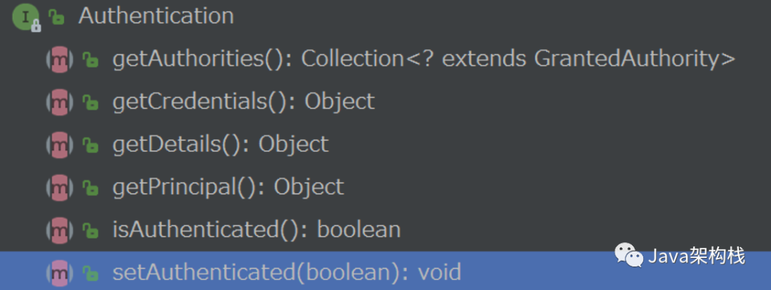 在用户登录认证之前,用户名密码等信息会被封装为一个Authentication的具体实现类对象。在登录认证成功之后又会生成一个信息更全面的Authentication对象,从该对象中可以 得到用户的权限信息列表、密码、用户细节信息、用户身份信息、认证信息等。